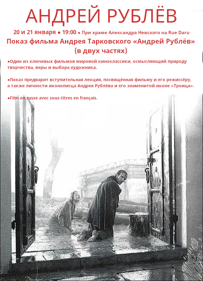 Показ фильма Андрея Тарковского «Андрей Рублёв» ( в двух частях). Комментарии священнослужителей и специалиста в киноведении и кинематографии.